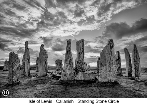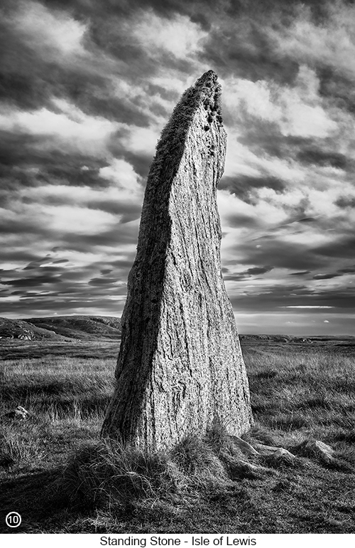 So after shooting the Drumlins, continue along the A858 towards Callanish, until you come to an unnamed turn off on your left, Street View, Map View and take this road to continue North. You are now getting very close to the main stone circle and should soon be able to see it on the top of a low lying hill in front of you. But before you get to the main stone circle and lose yourself in the atmosphere that seems to continually surround it, there is also what remains of another smaller stone circle on your left - there are actually quite a few other stone circles in this area you can walk around and photograph, but this one is easy to access and very much worth investigating with your camera. So think of this one as small but enjoyable aperitif, that will help to whet your appetite before you get to the main Callanish Standing Stone Circle, Street View, Map View. For SHOT 10, as shown on the left, I got in as close as I could to the main stone of this particular circle, so I could isolate it from its neighbours, who are not nearly as photogenic in my opinion. I then moved around and up and down etc., until I could find an angle that allowed me to emphasise the contrast of light and shadow along its edges, to make it stand out from its background. Now in the previous chapter, I introduced the idea of trying to incorporate 'Gesture' into your work and how powerful it can be if you do. So I started to wander around the stone with my camera looking for the best angle, when it struck me that from a certain position, it looked a lot like the fin of a killer whale sticking up out of the sea, with the blades of grass surrounding its base, similar to small waves lapping around it and which then gave me a narrative I could work with. So all I then needed to do, was to concentrate on shooting it in a way that would emphasise that narrative. So if you can now see the fin of a killer whale in this shot as well, then I have achieved my goal and incorporated 'gesture' into the shot, because as Minor White once so eloquently put it, "One should not only photograph things for what they are, but for what else they are." |
