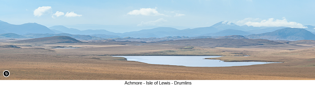 Then keep following the A859 for for another 35 miles or so, until you arrive at a junction with the A858 heading towards the East of the Island on your left, Street View, Map View and take the A858. You are now about 15 miles from Callanish ahead of you, but keep an eye out on your left for a great view across open moorland dotted with lochans and an horizon full of low round topped hills, which in Scotland are known as 'Drumlins', as shown in SHOT 9 below, Street View, Map View. |