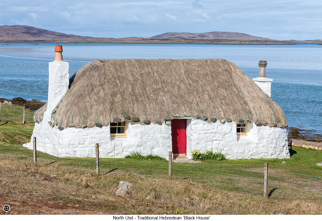 Once you land on North Uist at the Berneray ferry terminal Street View, Map View, drive out of the village on the B893 and then about a mile or so later, you will see a 'T' junction with the B8665. So take a right turn here and then head South towards the tiny hamlet of Sollas, Street View, Map View and a very pleasant 30 minute drive alongside the coastline on your right. Until you reach the view of a traditional Hebridean stone 'Black House', but which is now being called the 'Truman Cottage' and which is also available to rent I believe, as shown below in SHOT 13, Street View, Map View. So I imagine you are looking at the picture below and thinking to yourself, "why would it be called a 'Black House' if it is White?" Well there is some debate about this, but the modern thinking is that in the local and ancient dialect of Hebridean Gaelic (which is still widely spoken on the islands), when it was first encountered by early English travellers several hundred years ago, that they began to interpret and translate the ancient Gaelic tongue into English phonetically and which of course led to many mistakes and misinterpretations. So that the Gaelic word of "tughadh" meaning "Thatch", became incorrectly translated as "dubh" meaning "Black". Now "tughadh" and "dubh" look like two entirely different words when written down side by side don't they? But the way Gaelic is spoken (and rarely written down by the way), along with all its variations of dialect across the entire length of Scotland, Ireland and even some parts of Wales, means that some letters evolved to have different sounds and meanings, depending on where they appear within a word. So a "dh" within a word is pronounced as a "y" and has an entirely different meaning and pronunciation than if it appears at the beginning or the end of a word - but my Gaelic is very limited indeed and so I do not pretend to be in any way knowledgeable about this subject, other than to say, that when the words "dubh"and "tughadh" are spoken by a fluent Gaelic speaker, to a none Gaelic speaker such as myself, then both words to my untrained ear will sound pretty much exactly the same. There are other theories of course, such as the original design of these small houses not having any chimneys and instead the thick black smoke from the central peat fire, would just be allowed to waft up through the thatch so that it warmed up the rest of the house, but at the same time turning everything as black as the peat they were burning. And which probably also had the side benefit, of keeping the dreaded Scottish midges at bay throughout the summer months, because they will always shy away from the smell of smoke. But for whichever reason this inverse of black and white took place here in Scotland, it is at least good to know that after seeing these types of dwellings across the islands (and there are quite a few of them), you can feel confident that the next time you find yourself leaning against the pub bar, at the end of an evening spent listening to the local 'know-it-all', that you can now legitimately and truthfully argue with him, that black is indeed white and even show him the pictures to prove it... |