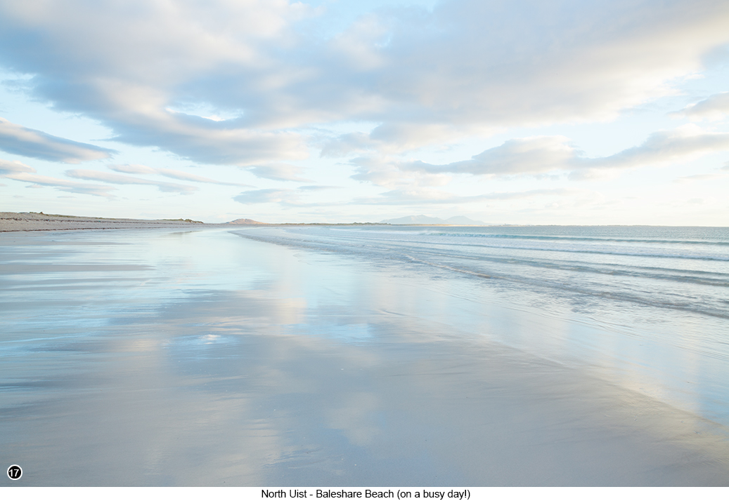 About 30 miles below Sollas on the A865, you will eventually come to sign for the village of Hosta pointing to your left and a gate across a sandy track to your right, Street View, Map View, with a Parking and Picnicking sign that points through the gate to the land on the other side. So take this right turn and go through the gate - and of course make sure you lock the gate securely again after you have driven through it, to stop any of the sheep or cattle from wandering out in to the road and causing an accident, or getting squished. So after driving through the gate, follow the sandy track as it arcs over to your right and park anywhere you can on the field nearest to the burn (stream). If you then walk down to the edge of the small burn towards your front right, you will see what is left of a small dilapidated bridge, which when I was last there, still had part of the old rickety bridge that I could wobble across. But it wasn't very safe and most of it had already collapsed into the burn or been washed away, so by the time you get here, the bridge may well be gone altogether. But you should still be able to easily jump across the stream if you follow it down and around to your left, to where it widens out and becomes a lot more shallow, as it flows out over the beach. Once on the beach at low tide (which is the best time to be here), you will see the rocks over on your right that contain these multi coloured marbled strata, as shown in SHOTS 14 and 15 above. It was raining gently when I took these shots, so the rocks were wet and which definitely helped to bring out all the colours. Also if you look up behind the rocks to the front right of the beach, you will see a fence with a hole in it and a path that leads up the side of the hill and then around the headland for a little way, to a really good view of some large rocky outcrops that point out to sea. Now even though I have already admitted that my SHOT 16 shown above doesn't really do this view justice, it is still a great location for a sunset shoot, with the waves breaking onto the rocks all around where you are standing, as the sun sets directly into the sea in front of you. Once having taken your shots of the coloured marbled rock formations and a view of the sunset that is probably a whole lot better than mine, return to your vehicle and get back onto the main A865. Because I am now going to take you to another tiny hamlet called Baleshare and a wide sweeping beach, that sits just behind a few nearby houses and which when we there, looked windswept and desolate, yet utterly beautiful at the same time and where we soon began to wonder, if no one but the two of us had ever walked across it before. This whole area is amazing and a great place for photography and hiking, with the peaks of a few low lying mountains poking up just above the distant horizon, as shown in SHOT 17 below. So continuing on from the bay at Baleloch and the multi-coloured rock formations etc., get back onto the A865 and continue driving South for another 12 miles or so, until you see a right hand turn signposted to Cladach a Bhaile Shear (Baleshare) and turn right here, Street View, Map View. Then continue on driving along this unnamed road for another 3 miles, until you see a dusty track heading off to your left and which will eventually lead you, to quite a large official car parking area at the end of it next to the beach, but that very few people seem to know about or visit Street View, Map View. Then once you are parked , walk down the short path near to the front right of the parking area and down onto the beach, for the view shown below in SHOT 17. Now the reason I have called this shot "North Uist - Baleshare Beach - on a busy day!", is because we spent two full days in this area, with at least 8 hours spread across the two separate days, both walking and photographing along this beach and we never saw another living soul. That is until about an hour before the sunset began on the second day, when an elderly gentleman dressed in the local tweed and a with well worn deerstalker hat perched on his head and walking with a stick made out of some sort of twirly looking wood (I know, you couldn't make this stuff up could you and I can't for the life of me think why I didn't swing around and take a photograph of him?) passed around the back of where I was setup, waiting for the colour to start happening in the sky. I turned around to say hello and smile cheerily at him (as you do) and in a grumbling voice he replied "Och it's busy on here today". Which I suppose could have been sarcasm, but it didn't sound like it to me and there was absolutely no one other than the three of us here, at least for as far as the eye could see in every direction and it been that way all the time we had been there??? In fact I am now going to digress for a minute, because this strange encounter with the grumbly old man, reminds me of another old dear that once walked past me, when I was shooting a sunset at a different viewpoint above the village of Plockton, near to where I live on Skye - and which I take you to in Chapter 59 starting on page 186 of my Guide Book. When this old lady, which I am guessing must have been getting up towards 90 and I am not exaggerating here, as she really was quite elderly, walked briskly past me in silence at the top of the viewpoint where I was setup and then headed off towards the front left edge of the rocky outcrop at speed and then further on through some bushes. Now to get up to the top of this rocky outcrop is only a relatively short hike, but at the same time it is still quite a steep scramble and which had both me and the missus huffing and puffing as we got to the top. So after the old lady had disappeared through the bushes and my brain had time to register what was happening and what I was seeing, I thought to myself, how did a frail old lady of such advanced years get up here in the first place and where she was going? Because ther