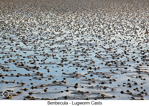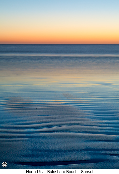 The image shown above in SHOT 17, was taken looking North just after we had walked down onto the beach from the car park and shows you how completely deserted this beach at Baleshare looks and how you can walk for mile after mile along what appears to be a pristine environment. So I would advise that if you do intend to walk for miles along this beach and stay here for several hours waiting for the sun to set as we did, that you also bring along your own food and refreshments, as there are absolutely no facilities or shops here, so whatever you need, you will have to bring along with you - but what a place for a picnic? SHOT 18 shown on the right, was taken around 30 to 45 minutes after the sun had set the following day. There was almost no light left in the sky, but I knew (hoped) by using a very long exposure, that the camera’s sensor would still be able to pickup the afterglow and colours in the sky that my eyes could no longer see. It was also a gin clear sky and is the reason why the wet sand in the foreground looks so dark, because it is reflecting what remained of the light, in the the dark blue but clear starry night sky above me. Now of all the photographs I have ever taken across the Western Isles (Outer Hebrides), this image on the right is probably the one I most enjoyed, as it brings back many pleasant memories of our visit to the Islands and even though it looks like an abstract, it isn't and is in fact a fairly straight long exposure shot and the nearest thing to night photography I have ever done and I as I look at it now, it makes me want to go back and do it all over again. It is also worth noting, that it was so dark by the time I took this shot, I couldn't see anything through the viewfinder and as the tide was now receding at quite a pace, if I wanted to use what remained of the light in the sky directly above me, reflected across the sand lines in the foreground in front of me, I could only take the shot when the sand was still wet. Which meant I was having to constantly shuffle my kit forward, to get it just beyond the highest point where the previous wave had reached and all before the sand had time to dry out. Which meant that I was continually having to re-set my hyperfocal distance point for a third of the way into the shot using Live View, which would have been virtually impossible without my trusty head torch, that I was hand holding and using to light up the foreground, so I could manually lock my focus onto what it was illuminating, before turning it off again just as I hit the shutter release button on my remote. So there I was shuffling around with my head torch in one hand and my tripod and remote in the other, as I kept advancing beyond the movement of the tide, as well as trying to use my large golfing type umbrella, to shield the camera from a blustery wind that had begun to blow in from my right. So as I only have two hands and they were both already full, I asked my dear long suffering wife to help me out, by holding the brolly next to the camera. I then got her to lower the brolly into the horizontal position and pulled her in as close towards me and my kit as I could, to block out the wind - and yes we had a quick snog under the stars, I mean it doesn't really get anymore romantic than this does it?. And which meant that she then became my mobile windshield, that I knew would automatically track along with me, as I kept shuffling further towards the sea and where the sand was still wet. So when you look at this image on the right, I bet you think it looks all tranquil and serene don't you? But I can honestly say that when I was taking it, there were moments when it felt like we had turned into a couple of clowns, performing a badly scripted slapstick routine at the circus. |
