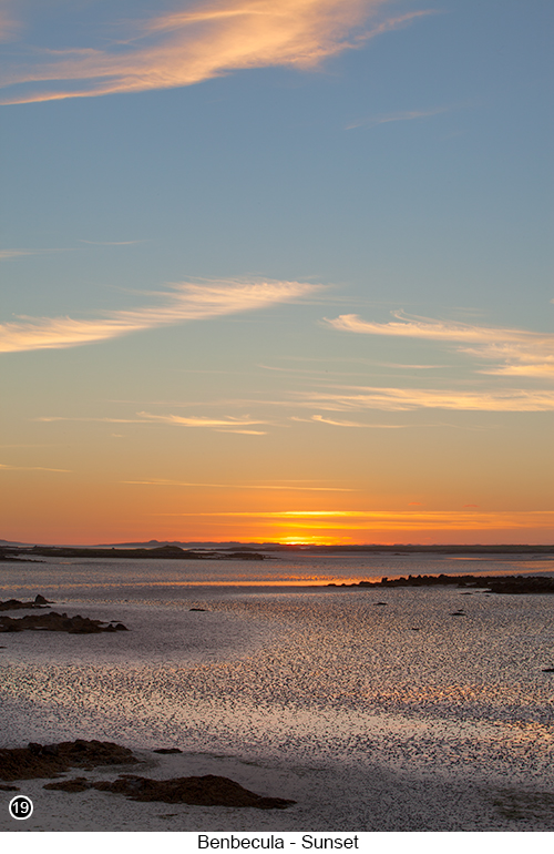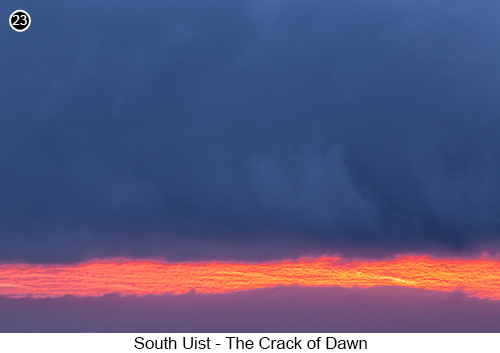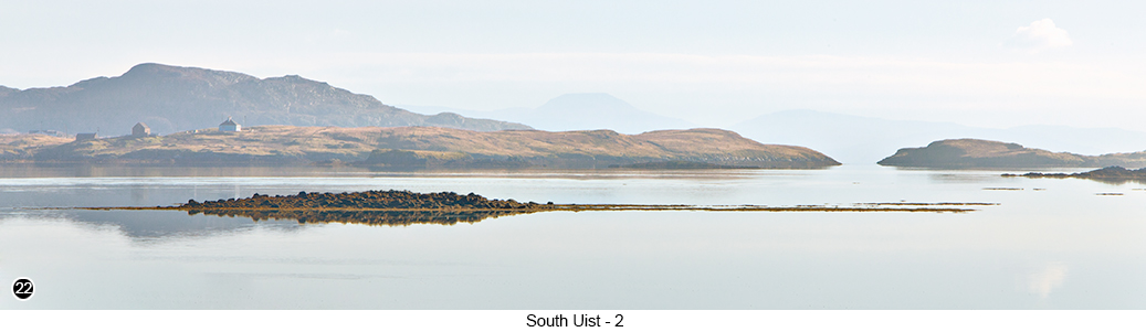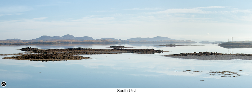 After taking your shots on Benbecula, carry on driving further South, as you continue to follow the main A865 all the way down to the bottom of the island and the causeway that links Benbecula to South Uist. Then then just over the other side of the causeway, Street View, Map View, you will see a wide view from beside the road, that looks back across a large sea loch and then further back towards the Southern tip of Benbecula. This stretch of water becomes dotted with small, low lying islands at mid tide, as can be seen in SHOTS 21 and 22 below, but which then looks more like SHOT 19 at low tide and open sea at high tide. | |