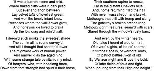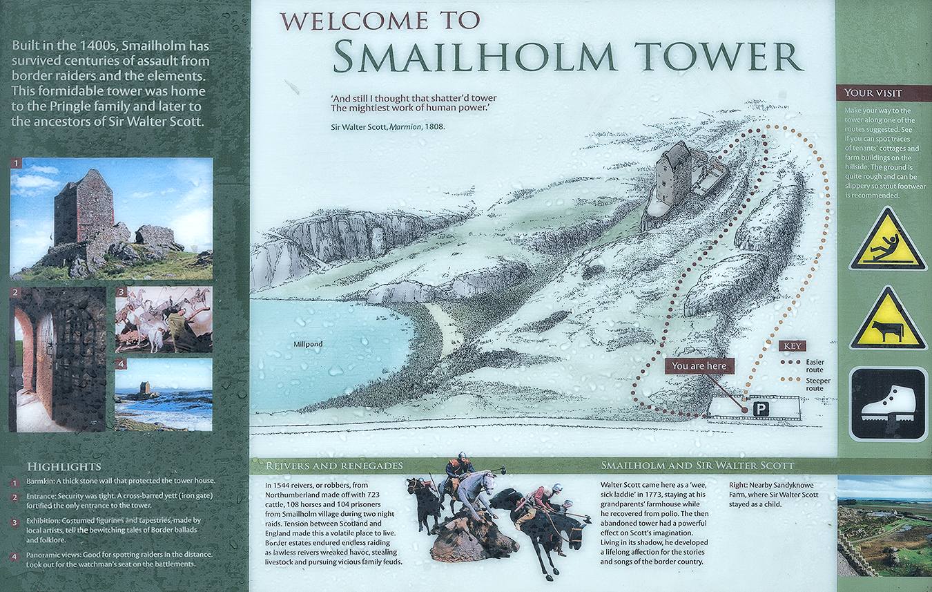 Setting the scene: The Border Reivers were a large, but loosely organised disparate clan of opportunist thieves and plunderers from both sides of the border, who for many generations had a totally free reign, across a wide stretch of land between the two kingdoms, as they continued to plunder and pillage whatever they pleased and from whoever they pleased. Then from around the start of the 1500's onwards, this area also started being attacked by squads of free roaming English soldiers, who were originally sent up to the borders to quell the increasingly brazen attacks by the Reivers and to implement law and order across the region. But which then quickly degenerated into yet more mayhem and violence, as the English army (Redcoats) continued to extend its control further North beyond the border and take whatever it could find along the way. This meant that the owners of fortified tower houses like Smailholm, were now under constant threat of unprovoked and quite often murderous attacks, coming in from all sides without notice. Be it from other local Scottish Clans trying to expand their control over the borderland area, as well as to increase their cut of the wealth and trade now being generated between the two kingdoms, to large gangs of marauding thieves and bloodthirsty Border Reivers, through to a newly mobilised and well equipped foreign army, who regarded themselves as not only being the law, but above it. So if you were lucky enough to be born into a wealthy Scottish land owning family between the 15th and 16th centuries, yet at the same time be unluckily enough to be living anywhere along the Scottish/English Border, then your home truly did have to become your castle, or you weren't going to be living there for much longer, or probably anywhere else for that matter. For more information about Smailholm Tower, how it was designed and constructed and some of the more notable families and people who have lived there over the generations, click this link for a larger full screen view of the information board, that you will find in the car park next to the tower. Sir Walter Scott's was also a regular visitor to the Smailholm Tower as a child and which he later wrote about in his poem "Marmion": |