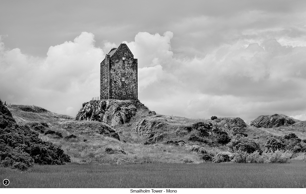 Having now parked your vehicle in the large official car park, you will see the tower directly in front of you, but with the bottom part of it obscured by a low rocky hill that sits in front of it. So to get a clear view of the tower without it being semi obscured by the hill, I walked back as fast as I could down the road I had just driven in on for about 50 yards, until I could fully see the tower on top of the crag more clearly and is where I then took the image shown at the top of the page in SHOT 1. I actually took SHOT 1 shown at the top of the page shortly after the storm had passed, but as this will probably be the first view of the tower you will shoot, due to it being the closest to the car park, so I am showing you that image first. I then continued walking at speed away from the car park and back the way I came in and then onto the other end of a small, but often reflective lochan - it is worth mentioning here, that this small lochan had completely grown over with reeds and grasses during this my most recent visit (see SHOT 2 above ) , but which was still open water when I came here only a couple of years ago in winter. So these grasses may actually die back during the winter months, to once again open up to what is a great view across quite a reasonably sized body of water in front of the tower, which on a calm day will give you the opportunity to shoot it with a reflection - and we all like a good reflection don't we? Or perhaps the farmer has drained this small lochan for some reason, or nature has taken its course over the years and filled it in with sufficient silt, to allow it to become completely overgrown with reeds and grasses, who knows? So if you try typing "Smailholm Tower" into your search engine right now, most of the images that pop up will indeed show you this tower with a reflective body of water in front of it, but don't expect it to be here any more, or at least not if you visit this location, at any other time than in the depths of winter, when this lochan might just temporarily open up once again. I then walked briskly back to my vehicle and the official car parking area, where I continued to scout for more photo opportunities, as the ominously dark clouds began to merge together and move towards me and which I knew, meant I wouldn't have much longer before the downpour would begin. So even though I did not have much time to wander around the outside of the tower, I still wanted to try and shoot the tower from a different angle and produce something, that I hoped would be different from all the other images of this tower you might find on the internet. But time and the elements were against me, so instead of going up to the tower and scouting around the base of it, I instead looked to see if I could get a little higher and then shoot the tower from a different perspective. I then walked past the car park on my left and further along the track heading away from the tower and then on through a large pair of open metal cattle gates, as I looked to see if there was a way I could easily get up to the top of the bracken and gorse covered rocky outcrop, that rises up behind the car park on the opposite side of the track to the tower - these large metal gates are usually left open by the farmer, when there are no cows or bulls grazing on this part of his land and so you are able to explore further up this track, but if these gates are closed, then the farmer has done so for a reason and so you will just have to stick to shooting from the area around the tower itself. I then saw an old wooden gate with a small thumb latch to open it on my right, in front of a short track that seemed to be leading up to a fenced off area at the top of the crag, so I went through the old wooden gate (making sure that I securely locked it again afterwards of course) and headed off up the track. Then once at the top of the track, I came to a fenced off area, around what looked like a small water treatment station, but where I could see a gap up the right side of the fence and the rocks. So I hurried up through this gap and which quickly led me up to a rocky outcrop area on top of the crag and a fairly unique view of the tower and the land that surrounds it, as shown below in SHOT 3. |