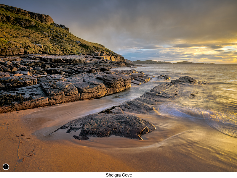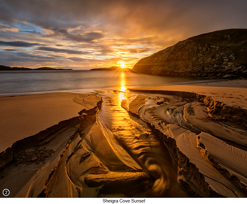 How to get there - Continuing on from the previous chapter, get back onto the A894 and continue driving North for another 13 miles or so, until you reach the small village of Riconich and a 'T' junction with the B801 and a left turn signposted for Kinlochbervie, Street View, Map View, now take this left turn and drive down the hill. Then keep going until you reach the outskirts of Kinlochbervie and where you will then see, a 'Y' shaped junction and a signpost pointing up the hill to Sheigra 4 miles away Street View, Map View. Take the right hand fork at the 'Y' junction and continue up the hill heading towards Sheigra. Next you will come to the tiny village of Oldshormore and another junction posted for the Oldshoremore Beach to your left, but keep heading straight on to the right, Street View, Map View - although the bay down at Oldshoremore is definitely worth investigating with your camera as well, but the reason we didn't when were there, is because the beach was already fully occupied, but more on that later... You will then pass through several more tiny villages, which are no more than a few scattered houses set next to the road, such as Blaimore and Balchrik, until you finally reach a left turn Street View, Map View, that leads down to the Sheigra Cemetery on your left. So turn left here and park anywhere you can in the large official car park next to the information board and access gate. You should now be able to see part of the bay to the front of you, past a few low lying sand dunes and a metal farm gate that you can walk through to get down to it - but make sure you secure the gate shut again after you pass through it, as there are lots of sheep in this area and if you leave the gate open, they will definitely make it their priority to escape and run amok throughout the nearby village. So having now parked in the cemetery car park, head off down towards the beach in front of you, as you walk along a rough sandy path that follows alongside a small burn to your left and then on past past several picnic tables also on your left. Until you come to the top back edge of the beach and where you will then see, where the burn is cutting a very interesting and very photogenic path, through the sand at the top of the cove as it flows out to the sea. Needless to say as you look at SHOT 2 shown below, it should now be fairly obvious to you that this tiny little bay, points almost directly to the West and so is an absolutely fantastic location for a sunset shoot. Especially from mid to late autumn and then all the way through to early spring, which is definitely the time you want to be here with your camera. But before you immediately jump in and start shooting your socks off and launch yourself straight into the burn shot, as shown in SHOT 2 below, instead take a few minutes to walk along the top of the sand dunes to your left and then over towards some very interesting rocks on the other side of the cove. Where you will then find there is a really nice alternative view of this tiny cove and the headland that juts out into the sea further over to your left, as shown in SHOT 1 above. What I did when I first arrived at this cove, was because the sunset was only just starting to happen and I knew I had about 20 minutes before it would be hitting its prime (see the Tip at the bottom of this chapter, for how I was able to quickly calculate this), I knew I had time to work my way across this tiny cove before the main event, so decided to start shooting over to the left of it. This meant walking along the top of the dunes at the back of the cove, so that I wasn't destroying any other shots I might wish to take next, by messing up the clean, undisturbed beauty of the sand, with my own size 10 boot prints - always try to avoid destroying your next compositions before you have even had the chance to look at them, by getting to a scene and then blundering straight out into the middle of it. But instead try to control your eagerness, as you progress slowly around the edges of the scene from left to right, before you finally start making your way into it and to the point where you think it will be at its most photogenic. |