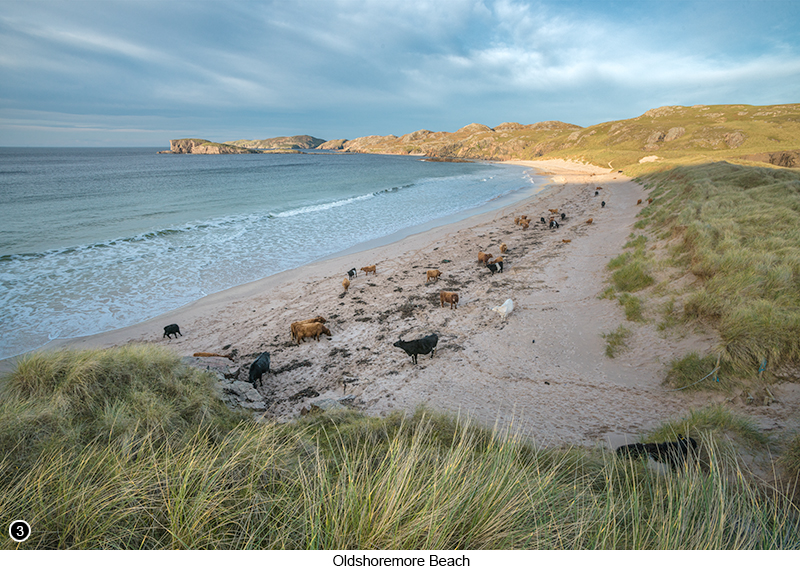 Having taken your shots of Sheigra Cove, if you now retrace your steps back the way you came in and all the way back towards Oldmoreshore beach Street View, Map View. But then take what is now a right hand turn and head on down the hill, as you follow the signs down to Oldshoremore Beach, where you will find a large official car parking area and public toilet facilities. If you then head up towards the left side of the toilet facilities, you will find there is a sandy path that leads you up to a viewpoint looking over the beach and a path that leads you down to the beach. But unfortunately on the day that we were there, the beach was already fully occupied by a herd of cows, as can be seen in SHOT 3 shown above, who are allowed to have free range in this area and so have become semi wild as a result. So not wanting to risk an encounter with these semi wild animals, as well as the fact that they had already completely churned up the beach and probably ruined any of the shots I might wish to take, we decided that this was about as far as we would go. As an aside, the reason you can quite often see cows wandering across some of the beaches around Scotland, is that the cows have learnt over time, that there will probably be lots of old 1 inch thick pieces of trawler rope, that have been washed up onto the beach at low tide. Which at some point in the past, must have been lost by fishing trawlers, as they snagged their nets on the sea bottom, or that perhaps got washed overboard during a storm. These old bits of trawler fishing rope, then become frayed and broken into pieces over time, by the constant motion of the tides across the rocks on the seabed. Which then allows them to soak up lots of salt out of the seawater, which in turn quickly becomes crystallised, as they dry out on the beach or under the sand. The cows then look for these bits of old fishing rope and chew on them for hours, to suck out all of the sea salt. Hence why this beach shown above is so churned up, because it seems that the cows absolutely love this sea salt and are willing to dig as many deep holes into the beach as it takes to find one. So if when you are here, you do see several cows with bits of old fishing rope, hanging out of their mouths as they slowly chew on them, with what I can only describe as a gormless trance like look on their faces, now you know why. |