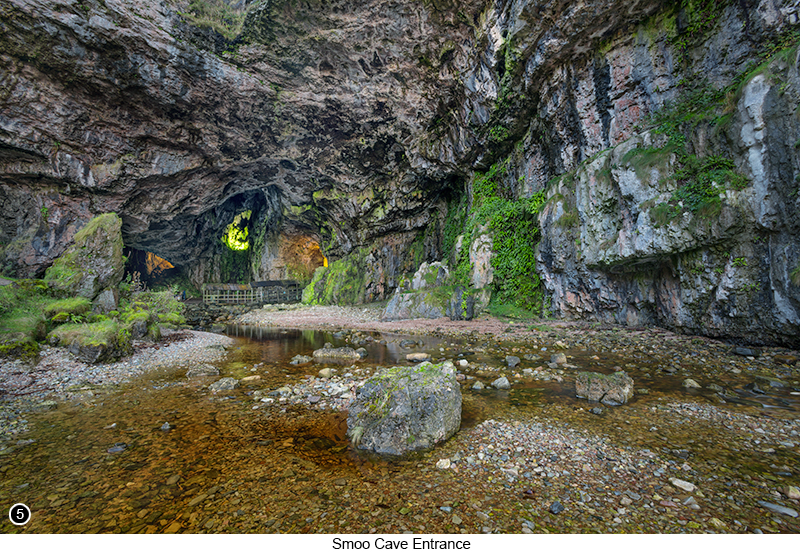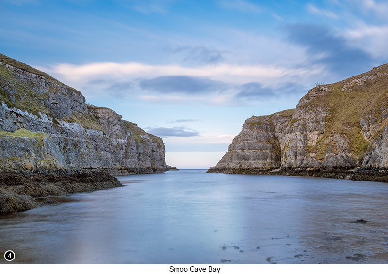 Having now shot your way around Sheigra Cove and Oldshoremore Beach, retrace your steps all the way back to the village of Kinlochbervie and then back to the B801 and then even further back to the main A838 and turn left, Street View, Map View, then continue heading North for another 14 miles towards Durness. You will then reach the village of Durness at the side of the main A838 road, Street View, Map View, so continue driving through the village as you continue to follow the A838 further North - although the local Spar shop that you will pass on your left in Durness, is well worth a visit and is somewhere where you can stock up on supplies and lots of other types of goodies, should you need them. Then once you drive out of the other side of the village and a couple of miles further on, you will see where the A838 road bends to the left in a slow arc, as it starts to rise gently up a hill, with great coastal views over to your left, as the A838 continues to wind its way along this coastal road towards Smoo Cave. You will then come to another area with a few houses scattered along either side of the road and the Smoo Cave parking area and toilet facilities on your left, Street View, Map View, so pull in here and park wherever you can. Once out of your vehicle, if you now walk across the car park heading towards your front left and to the left of the toilet block, where you will find an information board describing the area and the history of Smoo Cave etc., and a set of wooden stairs that lead all the down to the bay and a small bridge. You will now have lots of photo opportunities to shoot all around this tiny bay and of course, inside Smoo Cave itself. I would advise that you allow yourself at least a couple of hours of shooting time at this location, so that you can fully work this area to its full potential. Also a good time to be here I have found, is around mid tide, because then you can walk out onto the pebbly beach heading towards the gap in the Smoo Bay cliffs, for a nice long exposure shot of the bay, that will lead the viewers eye out into the sea and then onto the far horizon. Which even though I never got the chance to return to this West facing bay for a sunset shoot, I imagine could look amazing, especially if you time it so that the sun is setting directly down into the middle of the bay, as shown above in SHOT 4, but without a sunset happening unfortunately... |
