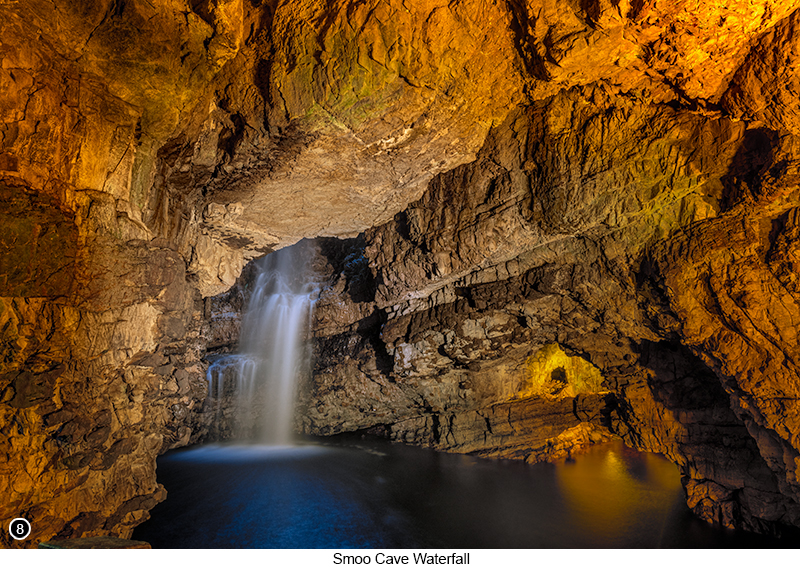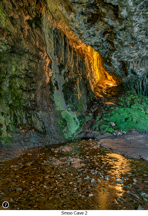 Then finally, I walked around to the other side of the cave and to the old covered wooden walkway and then into the inside waterfall area of Smoo cave, where I setup to take my final shot of the cave area, as shown in SHOT 8 below. Having visited this cave a couple of times before, I knew how it was lit and how the sodium lights that were being used then and that are still being used to this day (as of 2023), are casting what I think is a really quite ugly yellowish coloured light, over the walls of the cave. Sodium lights are slightly cheaper to run and don't use as much power and also seem to be longer lasting, so I understand why they are commonly used to light up monuments and other places that sightseers like to visit. But for photography they are not so good, unless you are prepared to endlessly fiddle around with your in-camera light meter settings, to work out the best balance of daylight and sodium light for each shot. So what I did for this chapter, was to shoot 2 of the shots (SHOT 6 and 7) using my normal daylight white balance settings and let the yellowish glow become part of the composition. But then in the cave waterfall area itself, I thought I would try to be a bit more creative and so here is what I did... I took a speed light with me on this occasion, which is not a piece of kit I normally take with me anywhere for my landscape work, but having visited this cave before, I knew that if I wanted to get anything useable from within the main waterfall area of the cave, I was going to have bring along my own sun, because it is very, very dark in there. So even though they have tried to light up the inside of the main waterfall area, with several horrible yellow sodium lights, there still doesn't seem to be enough light bouncing around for photographic purposes. But when you are in here, your eyes will adjust and you will think it looks quite well lit, but believe me it isn't. So I thought that what the heck, if I am going to bring along my own sun, then why not try to change the colour of the light it is putting out and so I threw on a really strong blue filter gel onto the front of the flash, in an attempt to counteract the yellowness of the sodium lights and this is the result as shown in SHOT 8 below. I set my speed light into its maximum zoom mode of 105mm, so that it was pushing all of its light into a relatively thin beam, that I could direct onto the water and the waterfall area. I then set my exposure for 30 seconds using my 10 stop ND and manually fired off about 5 flashes during the single 30 second exposure. This then had the effect of painting the waterfall with a deep blue directional light, whilst at the same time leaving the rest of the cave still bathed in the sodium yellow light coming from the lamps. This created a subtle yet weird effect, that I actually rather like and that is probably quite unique for this scene. Where my deep blue gel has actually balanced out the sodium filter and neutralised the colour of the rocks in the deepest part of the cave, yet at the same time left the rocks in the foreground still bathed in a sodium yellow glow. You can also see where the deep blue light from my gel, is being reflected off the bubbles in the frothier parts of the waterfall, yet at the same time, has helped to all but neutralise the main part of the water flow, into a more natural looking shade of white. Of course you could just adjust your white balance in-camera and if you are shooting in Raw mode, as I assume that you are, then you can tweak the light balance later in post. But I wanted to get the shot all in one take if I could and as I say, this is the result as shown below in SHOT 8. |