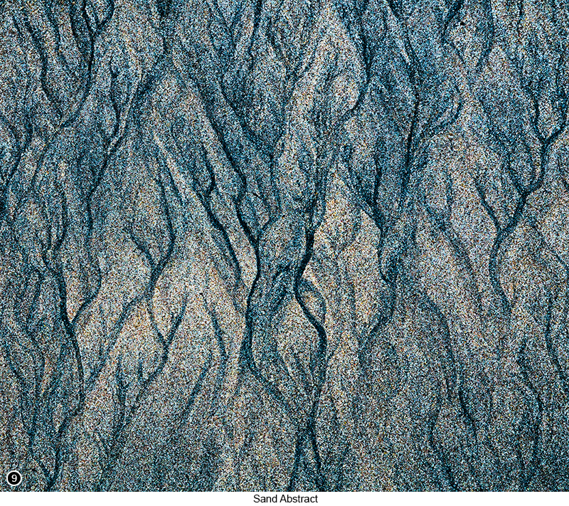 Tip: how to easily calculate the amount of time you will have, before any sunset hits its peak and how to do so the moment you arrive at any given scene, where you hope there is going to be a sunset taking place. You may already know this trick of course, but for those of you who don't - if your are an average sized male, then by holding up your fingers in the horizontal plane in front of your eyes and then aligning them so that the bottom edge of your lowest finger, is parallel to and running along the horizon. If you then add together 20 to 25 minutes for the width of each of your fingers, all the way up to where the top edge of one of your fingers, aligns with the bottom edge of the sun, this will give you an approximate timescale of just how long you have, before the sun hits the horizon and the sunset gets into full swing. If you are an average sized female, then do the same thing as described above, but allow around 17 to 20 minutes per finger. Obviously if the sun when you first arrive at the scene, is higher above the horizon than the width of four fingers, then just stack the fingers from your other hand on top and continue counting. ...and, if you run out fingers after stacking both hands on top of each other, then you have obviously arrived here far to early for a sunset, but none the less I commend you for being so keen to get started. So in the meantime, why not break out your medium zoom (24 - 105) or macro lens if you have one and have a wander around looking for abstract shapes in the sand, as shown in SHOT 9 below. But still only walking in places away from the burn, that will not ruin your later shots when the sunset does begin. |