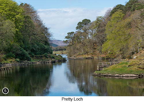 But immediately after taking the Dorlin Road turn off, you will soon arrive at a couple of really pretty viewpoints, that I know you will want to photograph, Street View of the Loch, Street View of the Bridge, Map View. One is of an old stone bridge, with a fast flowing burn running beneath it and which I didn't get a decent shot of, because it was far too bright and windy on both of the days we were there. And the second view looking down a pretty little Salmon loch, surrounded by the Lord of the Manor's private fishing piers and which I did manage to get a shot of and is why I am showing it to you here in SHOT 5 below right. | |