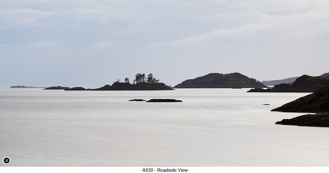 How to get there - From Arisaig and the Rhu Peninsula, get back onto the A830 where you came in and turn immediately right, Street View, Map View, as you now continue along A830 heading towards Fort William. Then after driving for another 7 miles or so, you will reach a new section of road that arcs around to your right, with views out to a line of small islands (Skerry) across the other side of the bay, as shown in SHOT 4 below. This is a view I have already discussed in the Morar chapter elsewhere on this site, so if you are interested in shooting this view (and why wouldn't you?), then please read that chapter first. Although I must say, that the view shown in SHOT 4 below, is a view I seem unable to drive past without wanting to take a shot or two of it. And even though I think the shots I have taken of this view so far are OK, I still think they are not showing it at its full potential, or better still during a sunset. Which means I will just have to keep going back for more, until I do get a shot that fully hits the mark for me. From Arisaig and the Rhu Peninsula to Tioram Castle, is a drive of around 30 miles or so and which should take you around 45 minutes or maybe a little longer. Because some of this part of your journey, is going to be along single track roads with passing places. So depending on when you are here and the amount of traffic (mainly tourists in camper vans in the height of summer, who are not yet used to driving along single track roads, especially in large eight berth vehicles), means it could take you considerably longer than 45 minutes to complete. |