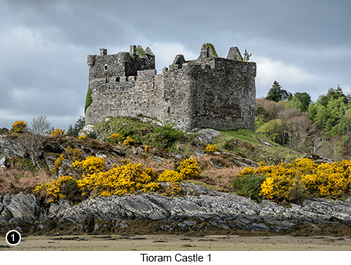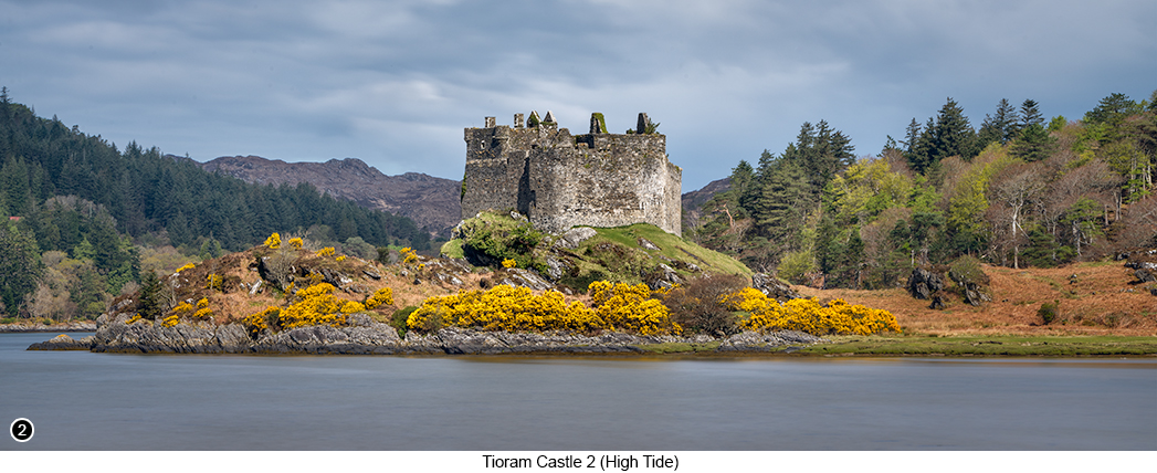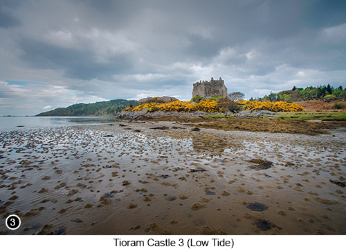 So I had to go back to my vehicle and break out my trusty old golfing umbrella, so I could shield my camera from the wind the best that I could. Which after maybe after an hour or so of trying, I finally managed to get a long enough lull in the wind, to grab this 30 second long exposure shot. I might also mention, that it was bitterly cold in the bay when I took all of these shots, even though the sun was shining brightly in all of these castle pictures, to make it look like it was a warm bright summer's day, it wasn't. Tip: I would advise that you should plan to visit Tioram Castle on at least two separate occasions, one when the tide is coming up to its its highest point and one when it is at half tide but receding. Or of course, you could stick it out for the full change of the tide, which takes around six hours 15 minutes from its highest point to its lowest point. The reason I suggest you do this, is to get a shot of the castle that is fully surrounded by water, you will need to be here and setup and shooting at full tide, or even a high spring tide if you can. Because even at a three quarter high tide, there is still far too much land connecting the island that the castle stands on, to the mainland, to make it look isolated and surrounded by sea. Also if you want to shoot the castle with its reflections in the wet sand, as shown above in SHOT 3. Then you need to be here as the tide is its mid point but going out, so that the sand is still be wet enough to give you those reflections. Because when the tide has fully gone out and the sand on the beach has drained, the foreground just becomes dry none reflective sand. And finally, if you can plan to be here, when the gauze bushes are in full bloom and surrounding the base of the castle, with bright, butter yellow flowers, then I know you will be so happy that you did. As this abundance of bright yellow flowers surrounding the base of the castle, just seems to add so much 'extra' to the shot. In fact I have shot this castle at least a half dozen times before over the years and never had as much success (or fun) as I did on this particular visit, just because I had taken the time to make sure I was here, when the gauze bushes were in the peak of full bloom. Yes the castle is still worth shooting at all times of the year and at any height of the tide and at most times of the day etc. But if you can time it to be here, just when these very photogenic castle ruins, are also surrounded by bright, butter yellow flowers and perhaps even at sunset, then why not? |