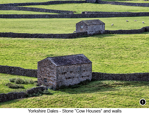 A notable feature of the Yorkshire Dales, are the many traditional old stone built "Cow Houses", that you will see dotted across almost every field, as shown in SHOTS 1 and 2 below. These "Cow Houses", or "Cow'uses" as the locals prefer to call them and which is pronounced as a 'Cowuzzez' in the local dialect. Date back to the mid to late 1700's and are thought to have replaced the much older, wooden built thatch roofed barns, from the late 1300's, as well as the Tudor period. The Cow Houses (or Laithes as they also became known), were designed as a two level structure, where the hay to feed the cattle, could be dried and stored in the upper level of the building, with the cows themselves and the heat that they generated, being housed in the lower level overnight. Then when the cows came back out in the morning, to graze on the fresh meadow grass during the day. The farmer would then use the manure they had produced overnight, to fertilise his hay fields. And is the reason why all of these barns, were built in the middle of the farmer's fields, so that they would be right next to where the muck spreading needed to take place. It is said that there are over 6,200 traditional stone built Cow Houses, still standing throughout the Yorkshire Dales, with many of them still being used for their original purpose. |