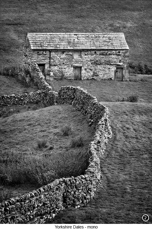 So all I am saying, is make your colour image as super colourful as you can, before converting it to black and white and which you can do in a variety of ways. For instance, you could try pushing up the vibrancy in Photoshop, or by going into curves and tweaking each of the colour channels. Or you could use plug-in's such as Nik Filters, or Topaz labs etc. Either way, just go over the top with your colours, to expand their tonal differences and separation, as much as you possibly can. Then convert it to black and white. Unfortunately I cannot give you a bullet proof list of steps to take here, or a Photoshop action that will do it all for you. As each image will require different amounts of colour enhancing, to get the best result when converted to mono. But once you have done this a few times, you will soon learn what works for you. But either way and for the best results, don't just convert your colour image straight into black and white, without substantially increasing the intensity of the colours first. Final thought: This photographic detour I am suggesting you take, to break up your journey to Scotland. Covers only a tiny part of the Yorkshire Dales in total and just one route through it. As you cross over from one boring motorway in the middle of the country, to another boring motorway on the West. So if you like what you see as you drive through here and I am sure that you will. Then perhaps like us, you should consider spending a full week in the Yorkshire Dales (in autumn?). To explore it in a lot more detail. |