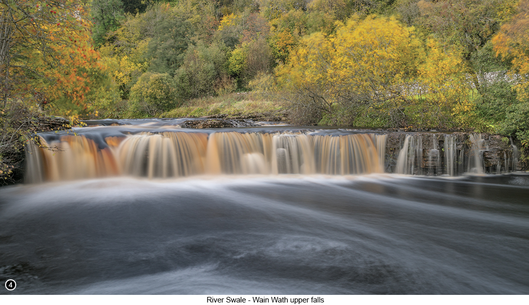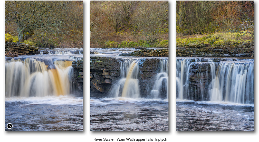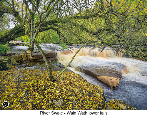 But for SHOT 5 shown immediately above and for this particular visit to the falls, I used my 24-105 zoom, for a five shot vertical orientation pano, swept from left to right. I did this so I could zoom right into the detail of the falls, yet still capture what appears to be, a wide angled view of the scene. I then blended and cropped the 5 shots into a pano using Photoshop, then into a three part triptych and which my wife would now like me to print big and hang on our living room wall. If you then walk a little further down the the bank of the River Swale and away from the upper falls, you will come to the lower falls, as shown in SHOT 3 above. These lower falls are not quite as photogenic in my opinion. Although if you frame your shot in a certain way, by getting down low, you can capture both of the falls in a single shot. And if you are really brave and the river is not too high and you have your wellington boots with you. Then you could even step out into the middle of the river, by using that large natural stone slab to stand on, which you can see in the bottom right of SHOT 3 above. There is actually a second gate further down the road away from the upper falls, which will also give you access to the lower falls, should you prefer to use it. |
