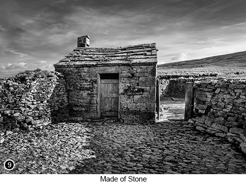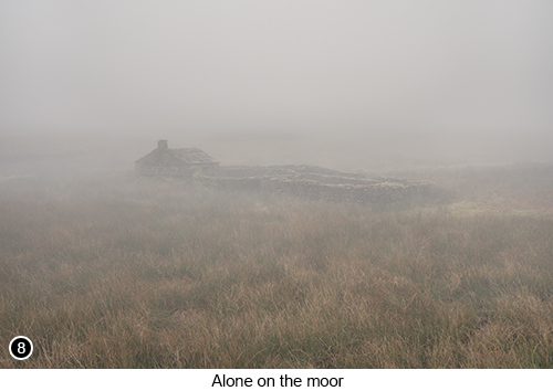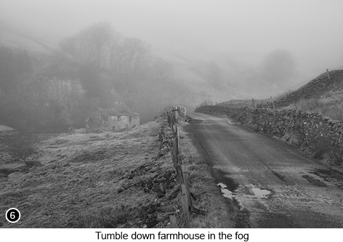 But in saying that, I have driven past this scene dozens of times over the years and never seen anyone or their animals near it. Yet on my last visit, when I went into the old cobbled stone courtyard, at the front of the building. It was obvious that this building had recently been used. Due to me having to watch my step, as I tiptoed my way around lots of piles of fresh sheep poop, that was lying around everywhere, outside of the main cobbled area. For SHOT 8 shown on the right, I walked a little way back up the hill we had just driven down, so I could capture a slightly elevated view of the old building, as it faded out into the fog rolling down from the moor behind it. I did this to give the old building, a feeling of remoteness and isolation and to emphasise the passage of time. Oh and the fog, was absolutely freeeezing! Then on another visit to this location, on a much warmer and sunnier day. I decided to get into the area around the old building and shoot it close in. The result of which, you can see below in SHOT 9. I do not know how old this building is, but I would guess by the fact it has a stone slab tiled roof, must mean it has got to be well over 300 years old and full of photographic character, as a result. When you first get here, you might be disappointed by its size, as it is tiny. But please don't be, because as you can see form SHOTS 8 and 9, it has huge photographic potential well above its size and is definitely worth your time to photograph. |